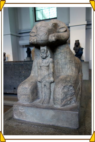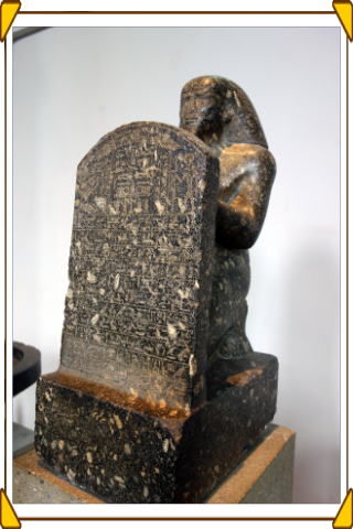 メンフィスで発見された遺物。プタハ神の創世神話が刻まれているが、後世の人達が臼として使用したため大きな刻みがあり更に碑文は摩耗していて読めない部分が多い。 |