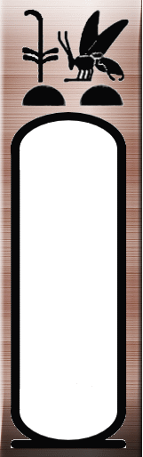 ネスウ・ビト(上下エジプト王)名=即位名 上エジプトの川辺に生息する葦のような植物と実り豊かな下エジプトのミツバチを並べて記し、カルトゥーシュと呼ばれる枠の中に名前を記す。カルトゥーシュとはフランス語で弾丸の薬莢を示す言葉で、ナポレオンのエジプト遠征時に形が似てることから名づけられた。古王国時代の初期から使われるようになった。 |