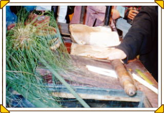パピルス草はカヤツリグサ科の多年生植物で、茎を薄くスライスして重ね合わせて乾燥させたものがパピルスと呼ばれる記録媒体(紙)です。ナイル川流域に広く自生していました。パピルスの製造には数週間かかり、大変高価な品で外国にも輸出されていました。記録には葦のペンを用いていました。古代エジプト時代以降も記録媒体として各地で使われ続けましたが、800年頃中国から紙が伝わると使用されなくなりました。現在ではエジプトの代表的な土産物として製造されています。
