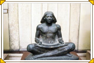 古代エジプトの識字率は非常に低く、読み書きの出来る書記は高等教育を受けたエリートでした。単なる記録係というより、政治、経済、宗教活動の重要な担い手であり、書記座像なども多く残っています。「書記」をヒエログリフで表すと、「筆記具」(パピルスとインクパレットとペンケースがつながった形)と「人」を組み合わせた形になります。